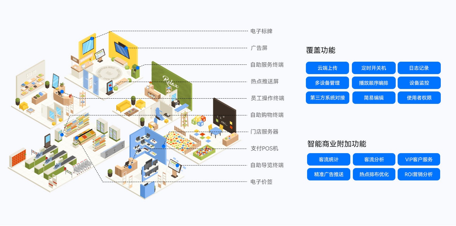 ONE游戏智慧零售解决方案搭配ONE游戏GDSM-ES智能零售管理系统,为全球零售门店客户提供了功能齐全的数字化运营管理工具,提供广告显示信息编辑、信息发布、AI识别、客户分析和会员管理等功能,实现对设备、内容、营销、运营的综合数智化管理能力,为精准运营管理赋能。