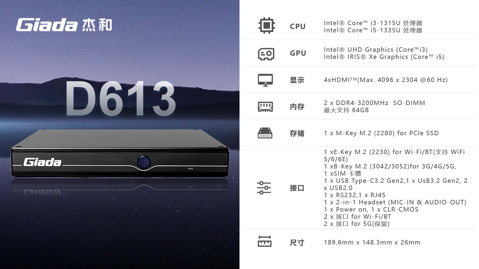 针对智慧零售对于数字化显示的多屏控制需求,推出四屏4K数字标牌播放器D613,搭载Intel® CoreTM i3-1315U/i5-1335U 处理器,具备4 x HDMI (MAX.4096 X2304@60 Hz)接口,可同时控制4台显示器,实现拼接、独显、复制显示,拥有60HZ视频编码和解码能力,实现4K 高清流畅播放画面,能为消费者提供身临其境的视觉体验,成为数字标牌、拼接屏、广告一体机的理想选择。