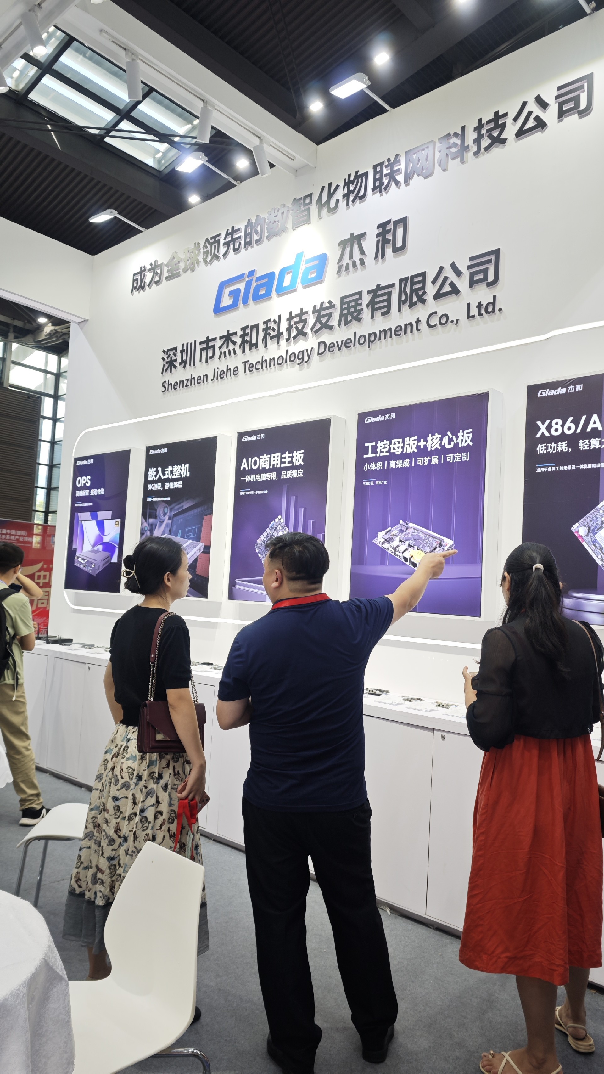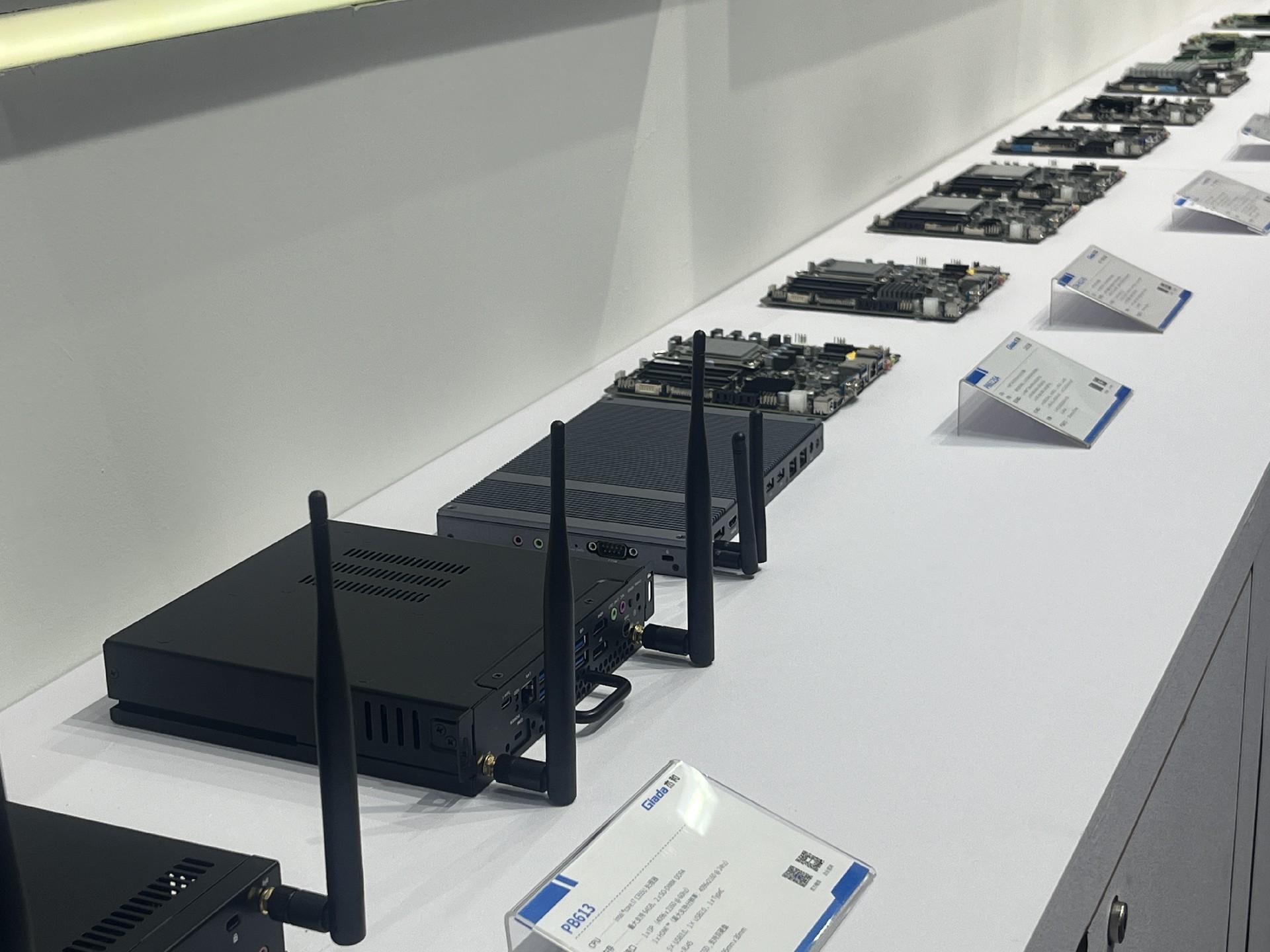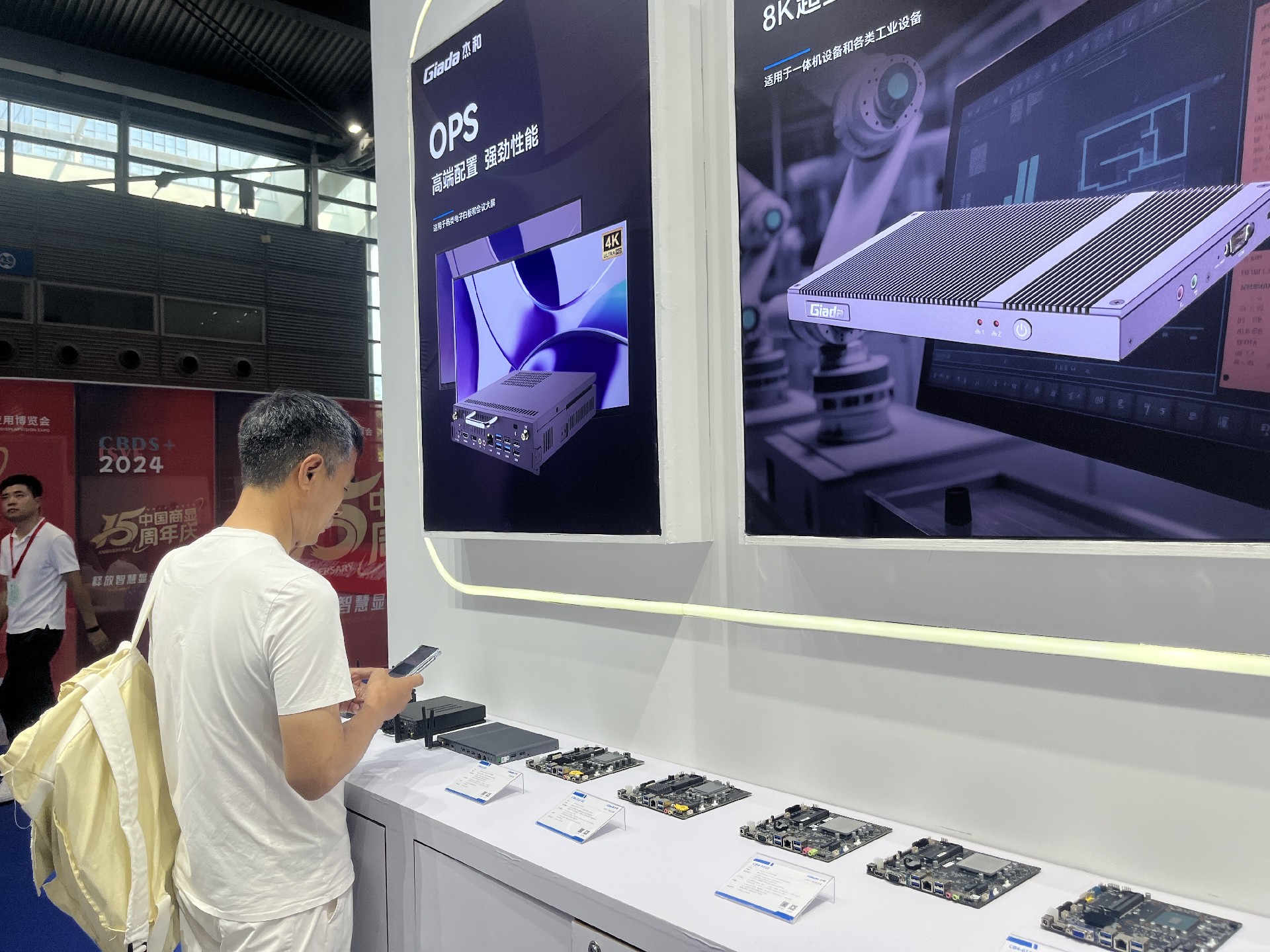 ONE游戏科技展位放置在c位的明星产品和最新产品吸引了众多参观者的目光。展台下方整齐排列着公司的产品,包括主板、嵌入式整机、OPS等,这些产品不仅适用于商业展示领域,还广泛应用于工业、制造业和教育业等多个行业。