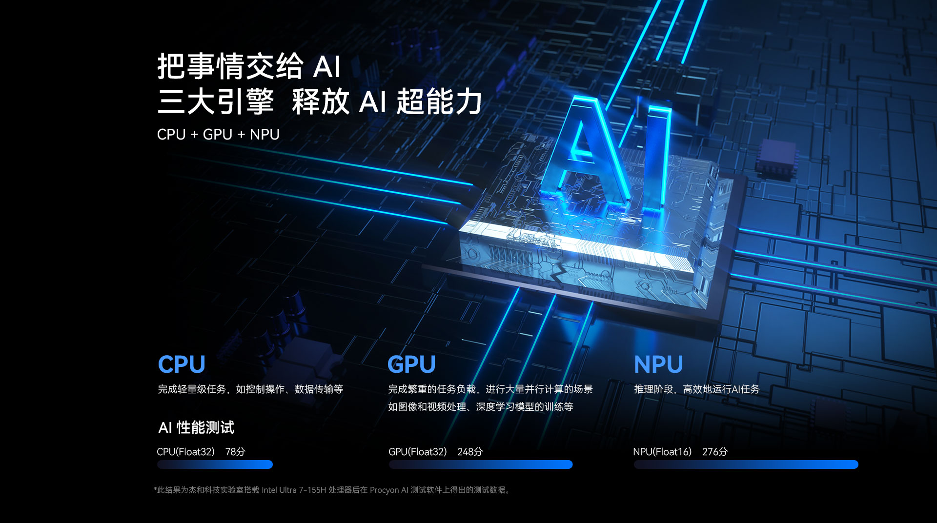 ONE游戏科技N601搭载了Intel® Core™ Ultra处理器,可选配Ultra 5- 125H或Ultra 7-155H,全新架构拥有CPU、GPU 和NPU配置。在ONE游戏科技实验室里,我们专门用 Procyon AI 这款 AI 性能测试软件对搭载了 Ultra 7-155H 处理器的 N601 进行了测试。最后测试结果显示,N601的CPU分数为78分,GPU 分数为248分,NPU分数为276分,这意味着N601在AI处理方面具有显著优势,能够高效地处理复杂的神经网络计算任务。