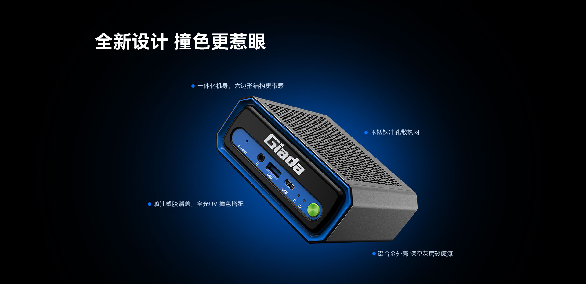 N601不同于传统工业风设计,炫酷的一体化机身,顶面为不锈钢冲孔散热网,正面是六边形结构,全光UV 撞色搭配,喷油塑胶端盖,铝合金外壳,美感与功能兼具。