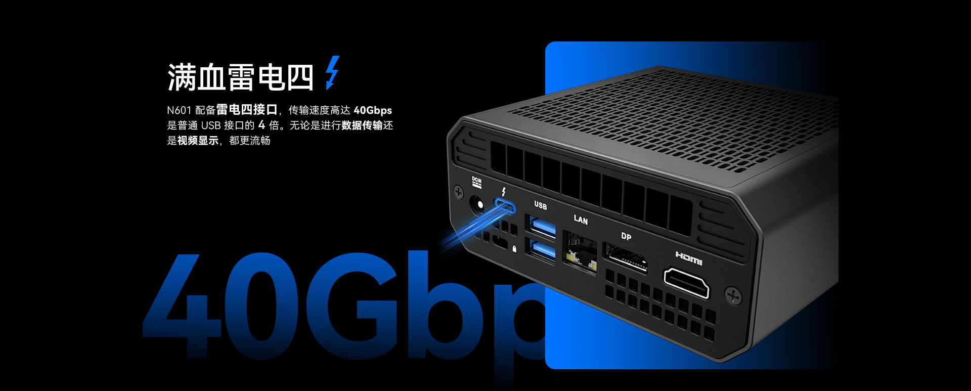 ONE游戏科技N601配备雷电四接口,传输速度高达40Gbps,用户可通过该接口连接2块屏幕。还可通过HDMI2.1接口,DP1.4接口再连接两块屏幕,实现四屏异显。雷电四还可以连接外设,如鼠标、键盘、控制器和耳机等。
