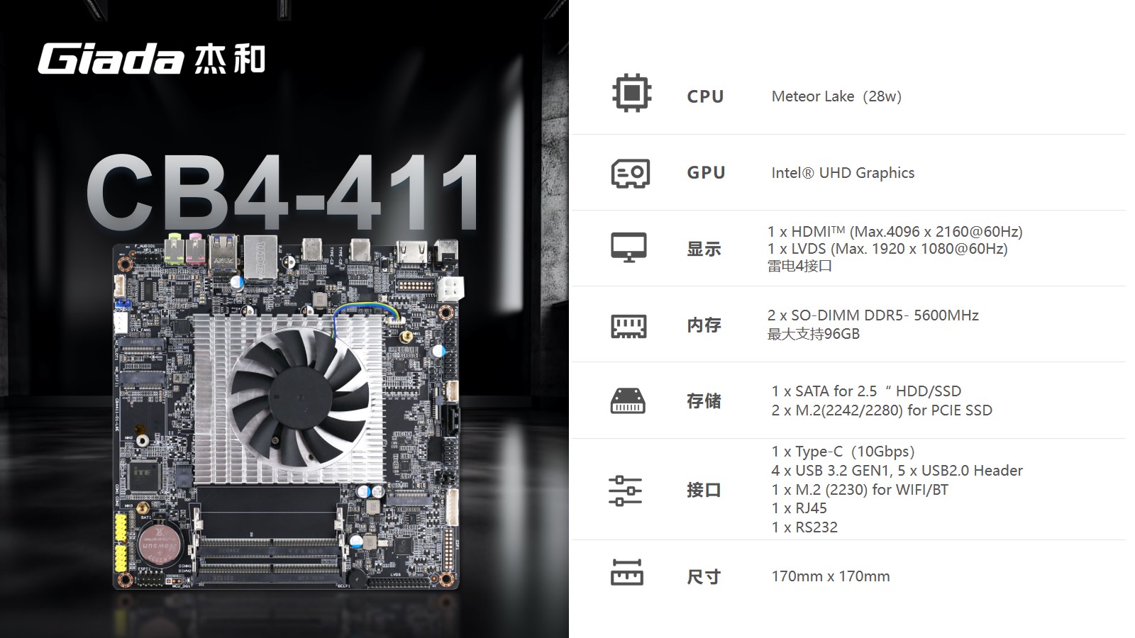 CB4-411 支持HDMI2.0、eDP/LVDS、雷电4接口显示输出,内部还有丰富IO接口,支持两个PCIe4.0 x 4插槽和1 x SATA3.0接口,满足用户更多存储需求。