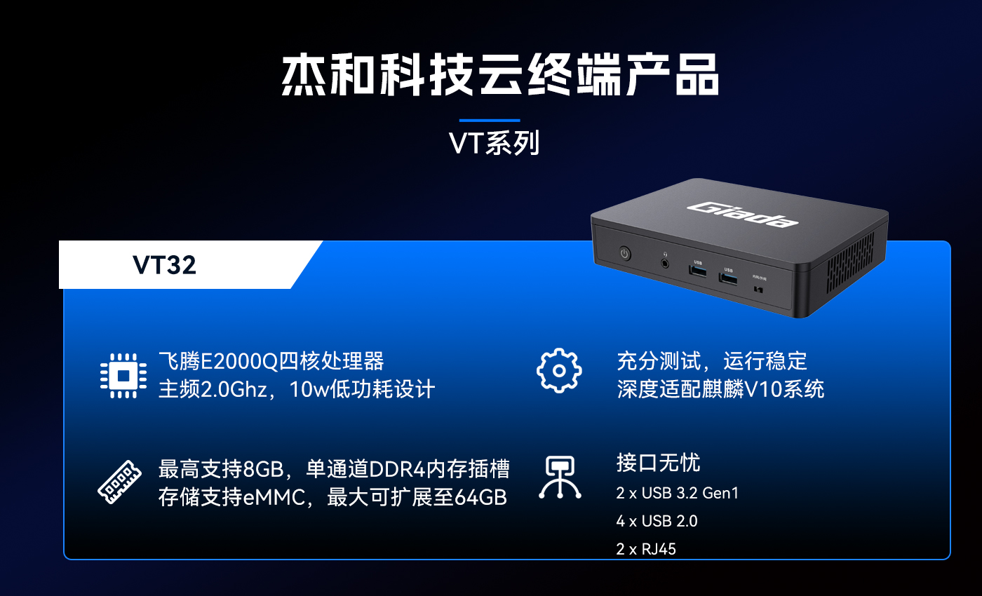 近期ONE游戏科技推出的云终端VT32,以国产飞腾E2000Q芯片作为核心处理器,深度适配国产银河麒麟V10系统,在政务、金融等对数据安全要求极高的领域深受关注。