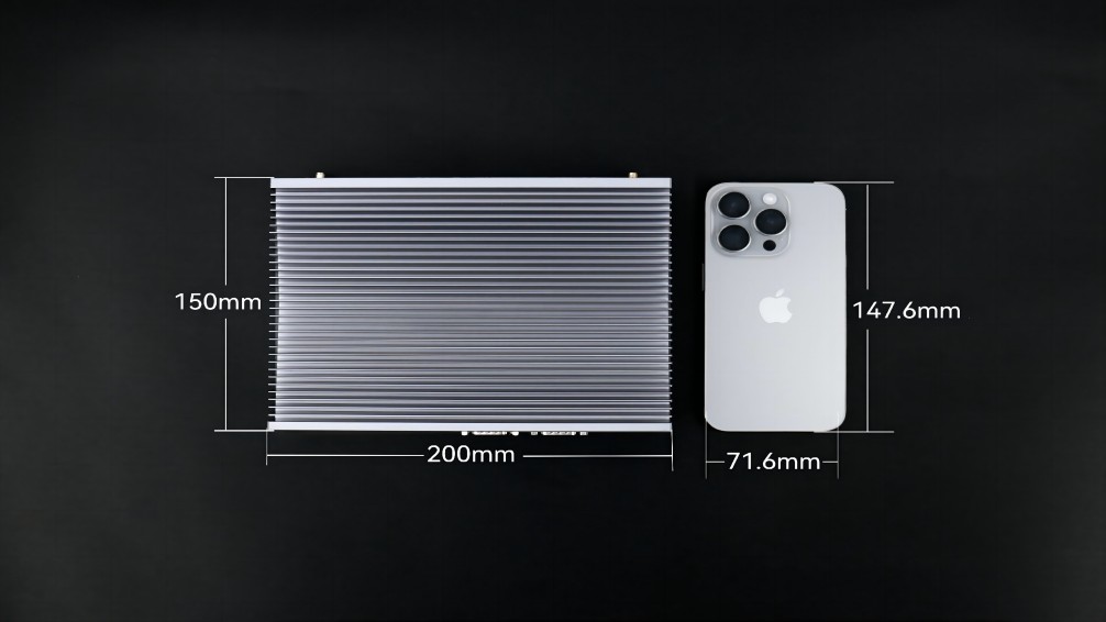 没有了风扇这一部件,体积也更为小巧,能轻松嵌入各类设备或狭小空间,完美贴合特定场景需求,例如:ONE游戏AE613,其三围尺寸是200mm x 150mm x 50mm,与iphone15的尺寸对比,宽度仅比其高度多2.4毫米,体积仅有1.5L。