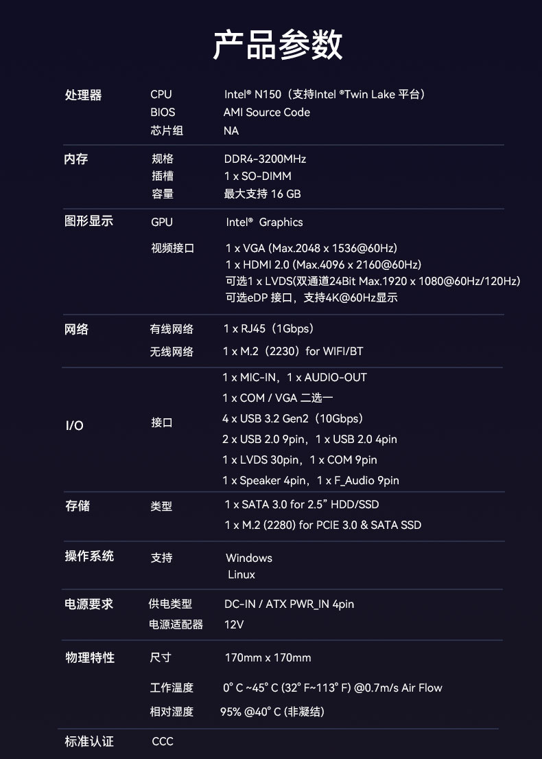 代号为Twin Lake的N150处理器,是英特尔在2024年底推出的适配中低功耗计算场景的新品,也是Alder Lake N100处理器的升级版本。它采用E核配置,可以为低功耗设备提供更高效的计算能力,兼顾性能及扩展性,是提升生产力的核心硬件。