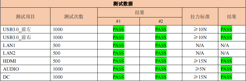 AF208实验前后外观无异常变形,无噪音增加,在 BIOS、OS 下硬盘、DIMM 没有掉失,且槽位号正确,电源、硬盘、网卡等指示灯显示正常,压力软件运行正常,没有出现性能异常现象,所有接口功能正常。