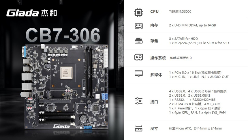 CB7-306主板搭载飞腾腾锐D3000处理器,8核2.5GHz主频设计,支持双通道DDR4内存与 PCIe 5.0扩展。在政务办公场景中,可同时运行公文处理、视频会议、数据统计等多任务,操作流畅度媲美传统高端PC。