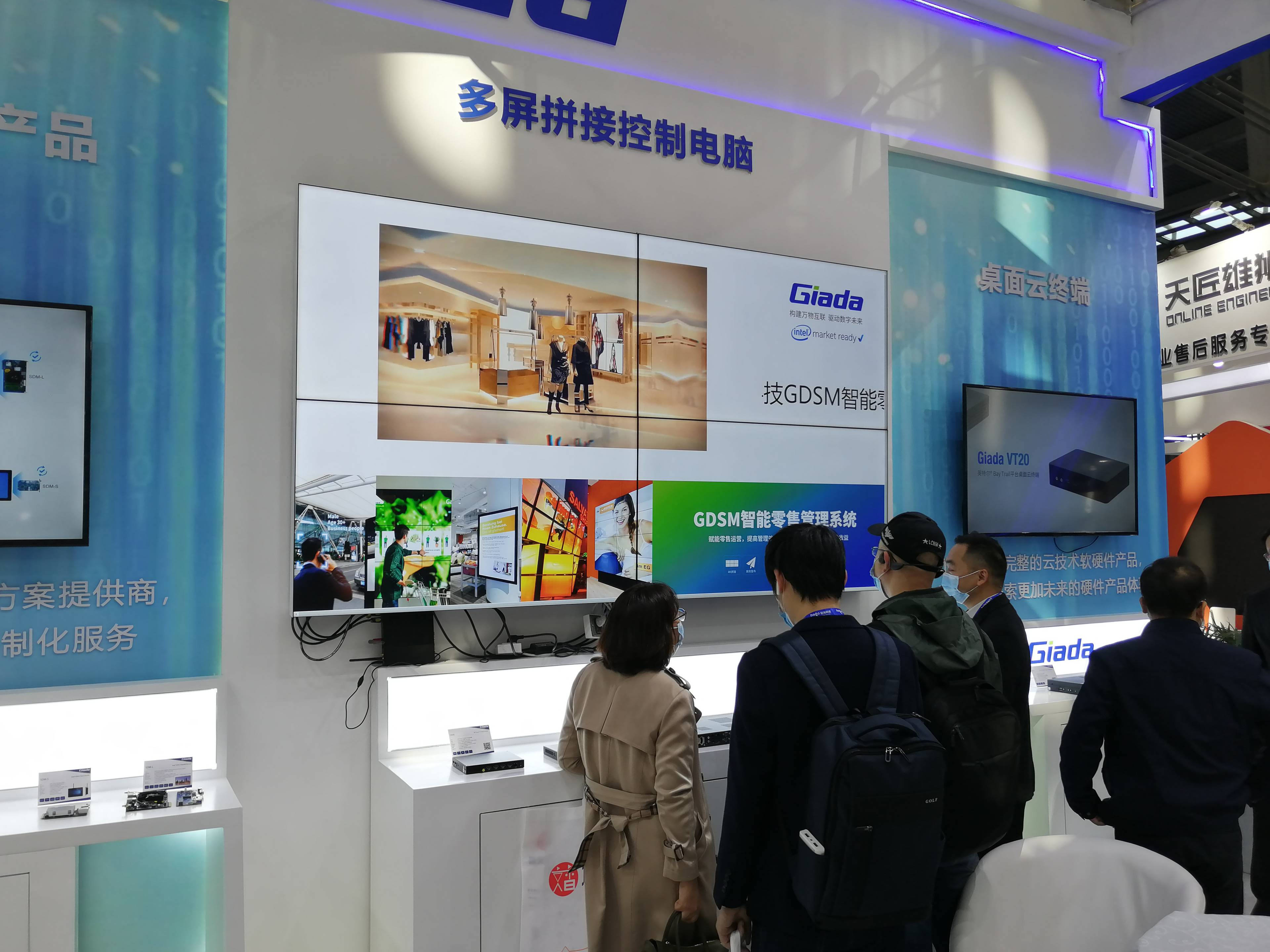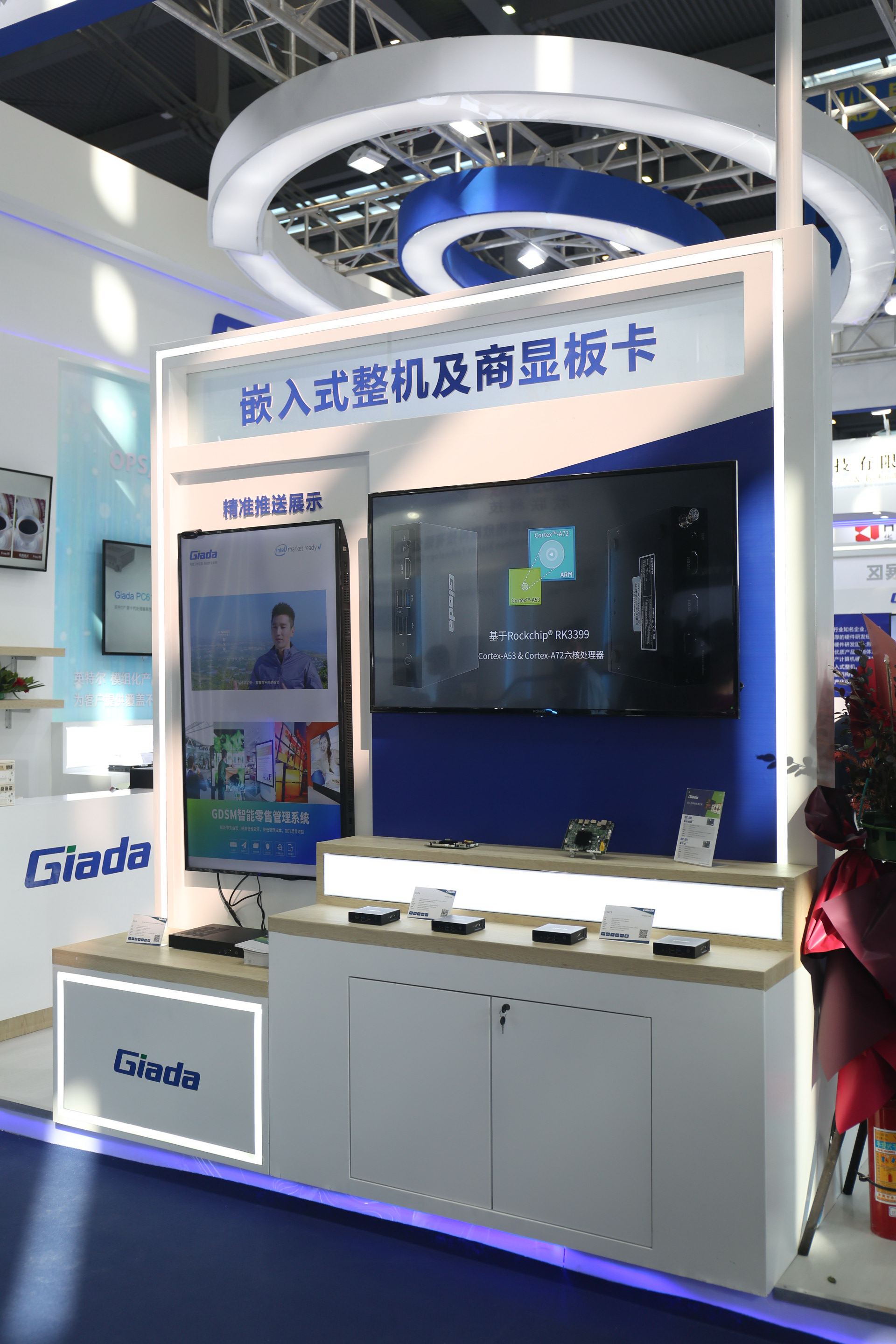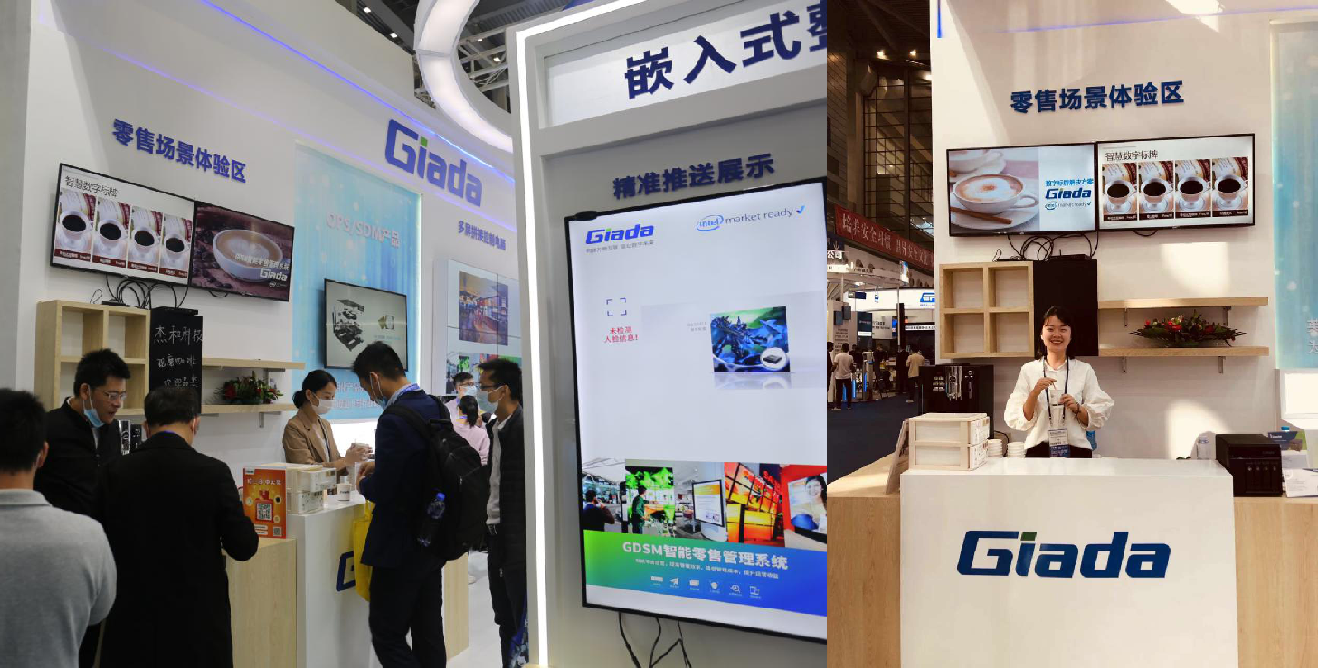 紧邻ARM架构商显产品集的精准推送展示区与零售门店模拟展区,共同组成了本届展会ONE游戏科技展位的一大精彩设计。场景展现了GDSM智能零售管理系统在零售门店场景下的展示效果,顶部的数字标牌由GDSM系统推送内容,模拟搭建了针对人流动线的广告精准推送形态。