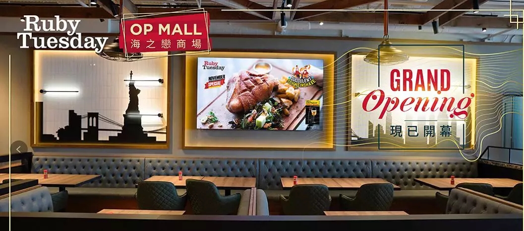 ONE游戏科技是Ruby Tuesday连锁餐厅智慧化项目的方案提供商。ONE游戏承担了整个餐厅的多媒体信息系统架构的设计以及终端媒体播放器的安装和部署,帮助餐厅实现了6屏拼接、4屏拼接及86寸超大屏显示,使餐厅的商业环境和品牌形象得到了极大的提升。