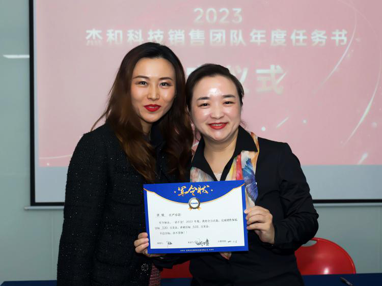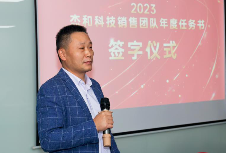 签约仪式中,国际营销中心业务代表刘正文和国内营销中心业务代表李喆发言,两位代表朴实的发言表示,销售人员必须要努力和坚持,要有愚公移山的精神才能成就了2022年的可喜成绩,同时完成2023年度目标必须怀着奋斗者的精神去努力拼搏,2023年我们业务会冲到前线,紧贴市场,紧贴客户,抢夺订单。