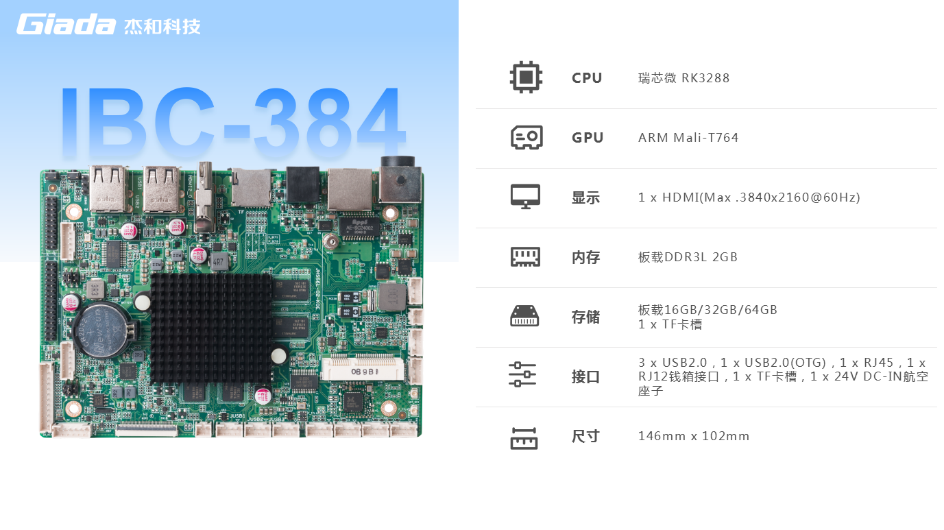 和IBC-384嵌入式主板是专为零售收银设备设计的高性能主板,具备 1X24V 前空接头 DC-IN 和 RJ12钱接口它提供可的电源供应和便捷的钱箱连接,适用于各种收银系统的应用场景,同时具备优异的处理能力和稳定性。