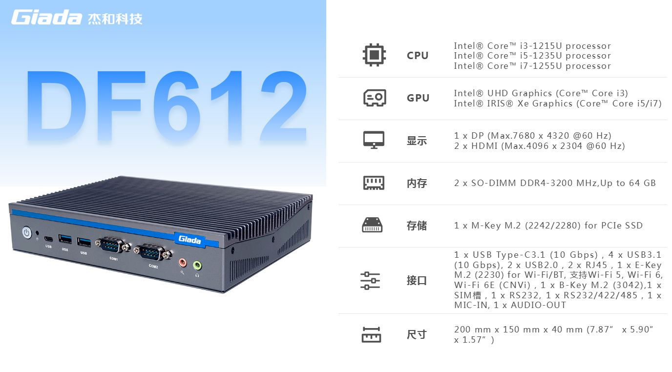 ONE游戏科技,商用显示硬件解决方案领导者,深耕商业显示领域24年,业务遍布欧洲,美洲,东南亚和南非等60多个国家,服务超过3000名客户,自有品牌 Giada 已成为欧洲数字标牌媒体播控器的领导品牌。在DF系列产品中,DF612作为一款全新的嵌入式计算机,搭载英特尔第12代Alder Lake处理器,具有突破性的技术、增强的图形处理能力和丰富的I/O接口,广泛应用于商业显示、智能车载、安防领域和边缘人工智能等场景。