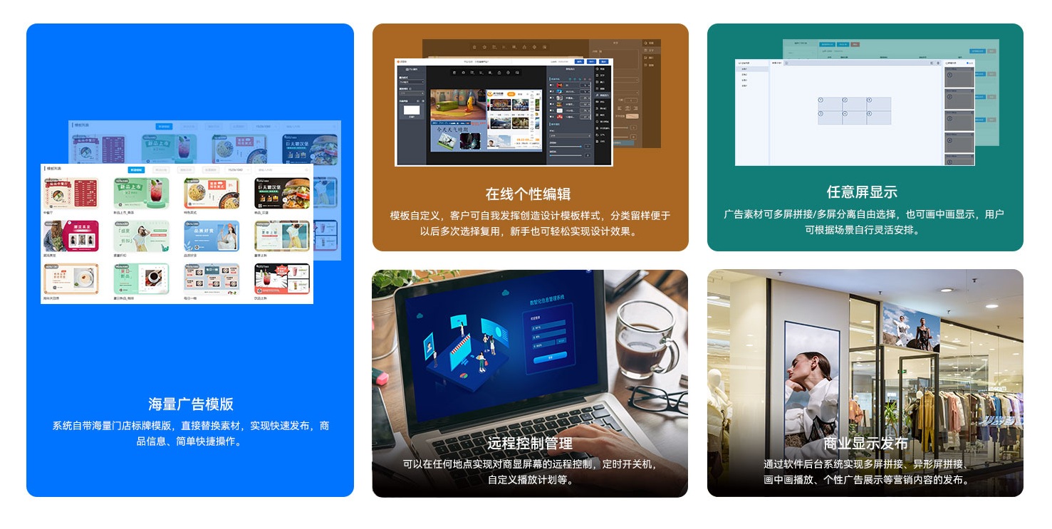 ONE游戏科技为客户提供可靠的硬软云一体化服务,针对商显领域,除了为客户提供数字标牌等硬件产品,同时也自主研发了ONE游戏GDSM-C数字化信息发布管理系统软件,作为全方位的远程信息编辑发布及设备管理系统,提供丰富广告素材与人性化编辑工具,用户可发挥自我创造能力,新手也可轻松实现大师设计效果,同时可实现多屏拼接/分离、画中画等自由选择,可根据应用场景灵活安排,满足大型会议、百货商场、体育赛事、金融证券的等多种智能显示需求。