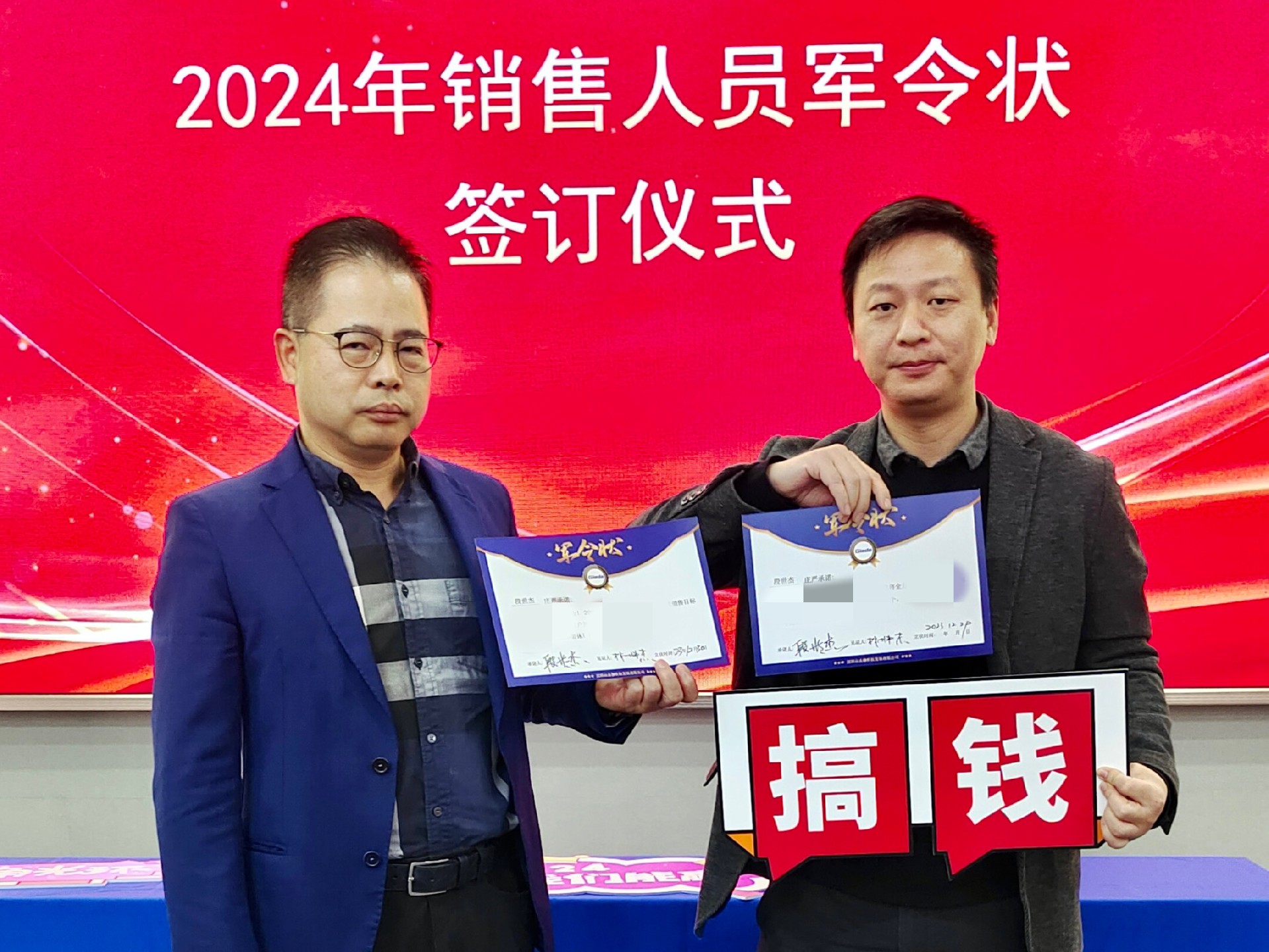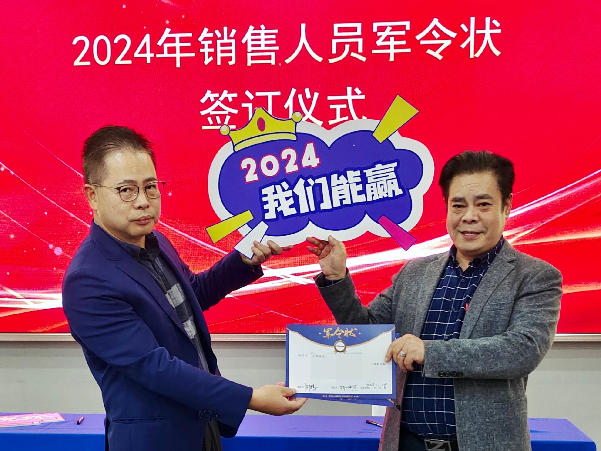 2024公司年度战略目标确立,言出必行,使命必达,国际/国内销售团队为了共同的目标开始军令状签约仪式。一纸军令状,是ONE游戏科技与销售人员的双向承诺,是压力,更是动力。是不破楼兰终不还的决心,更是春风得意马蹄疾,一日看尽长安花的期待。
